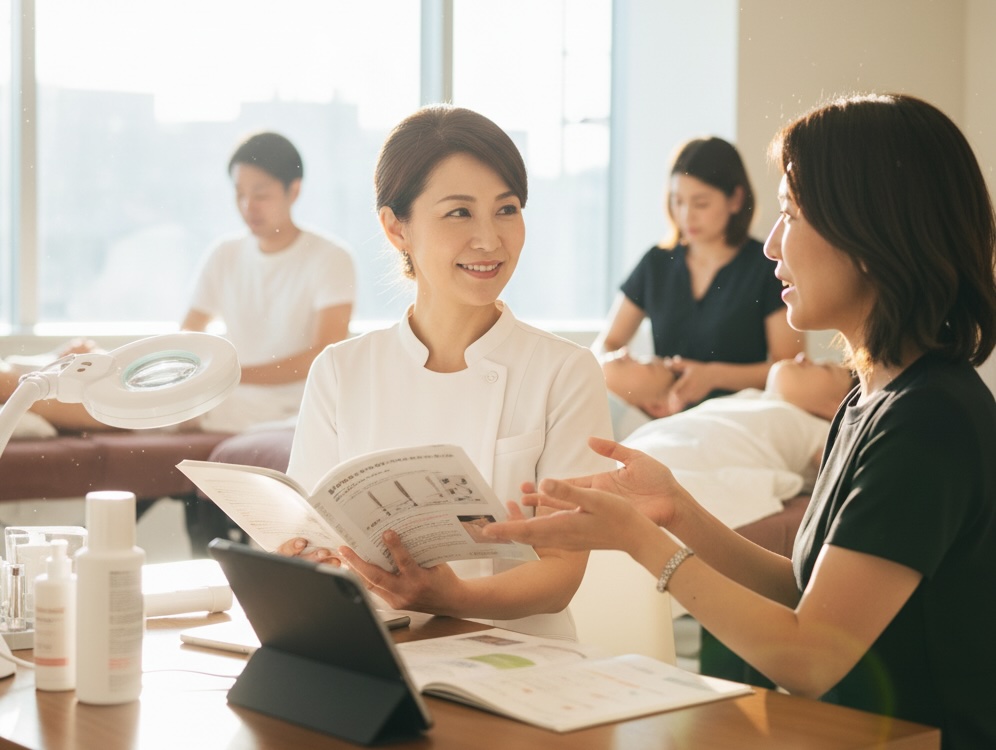 いろんな悩みに対応できるように勉強して、知識を身につけるのがお客様の肌悩みを解決し、喜んでいただく、ひいてはリピートされるエステティシャンになる第一歩です。